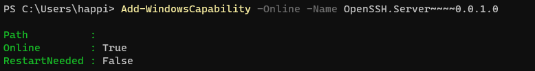 Add-WindowsCapability -Online -Name OpenSSH.Server~~~~0.0.1.0执行结果: