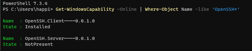 Get-WindowsCapability -Online | Where-Object Name -like 'OpenSSH*'执行可能结果如下:
