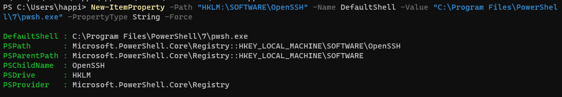 New-ItemProperty -Path "HKLM:\SOFTWARE\OpenSSH" -Name DefaultShell -Value "C:\Program Files\PowerShell\7\pwsh.exe" -PropertyType String -Force执行结果:
